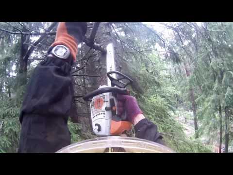 Валка сухих елей в Пансионате "Северное сияние" в Валдае. Деревья находились между забором и зданием котельной, в прошедшем году их одолел короед и они засохли. Спилили по частям со сбросом и раскряжевали на дрова в котельную.